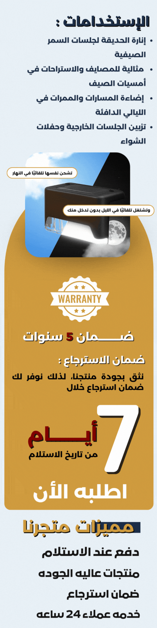 تشحن تلقائيًا خلال النهار وتضيء تلقائيًا في الليل لتمنحك أجواء مريحة وآمنة.